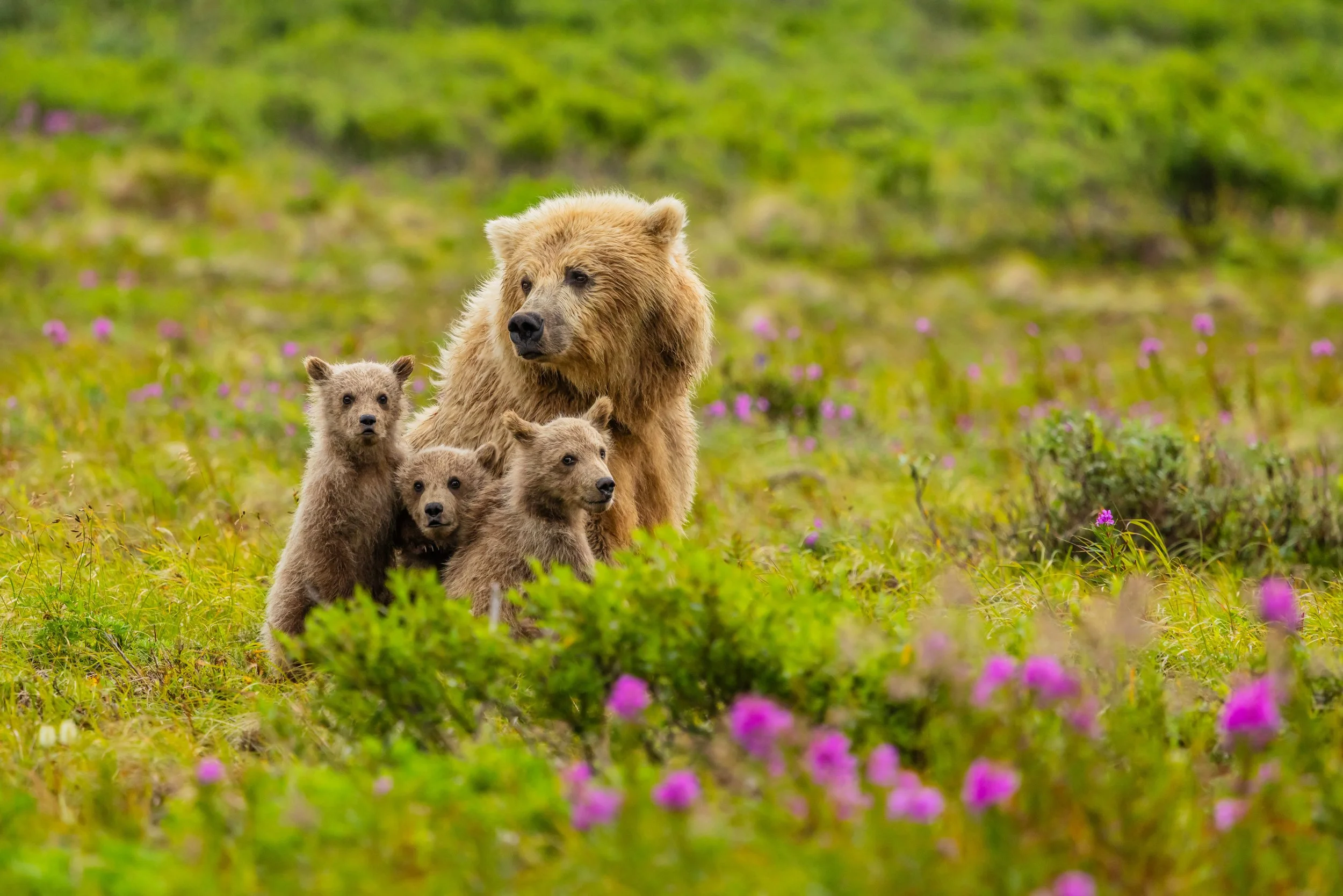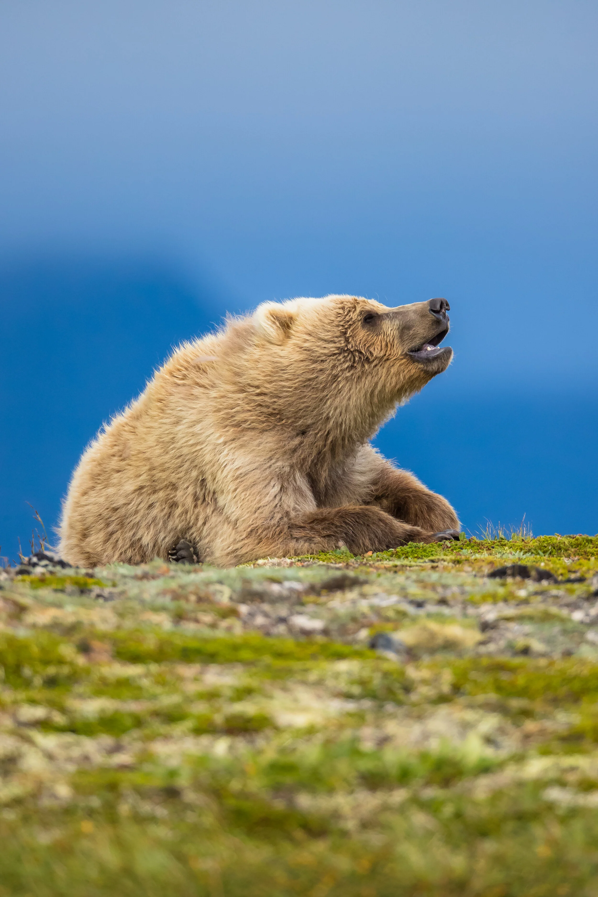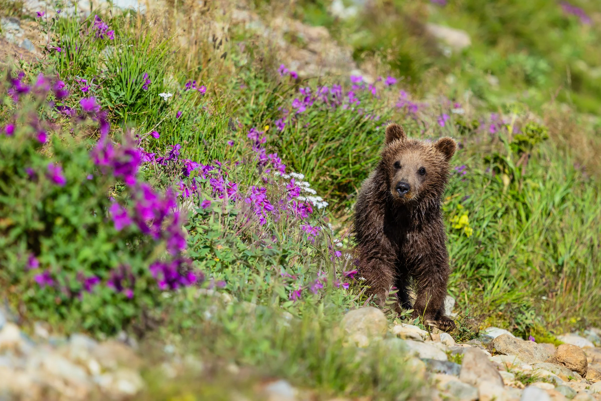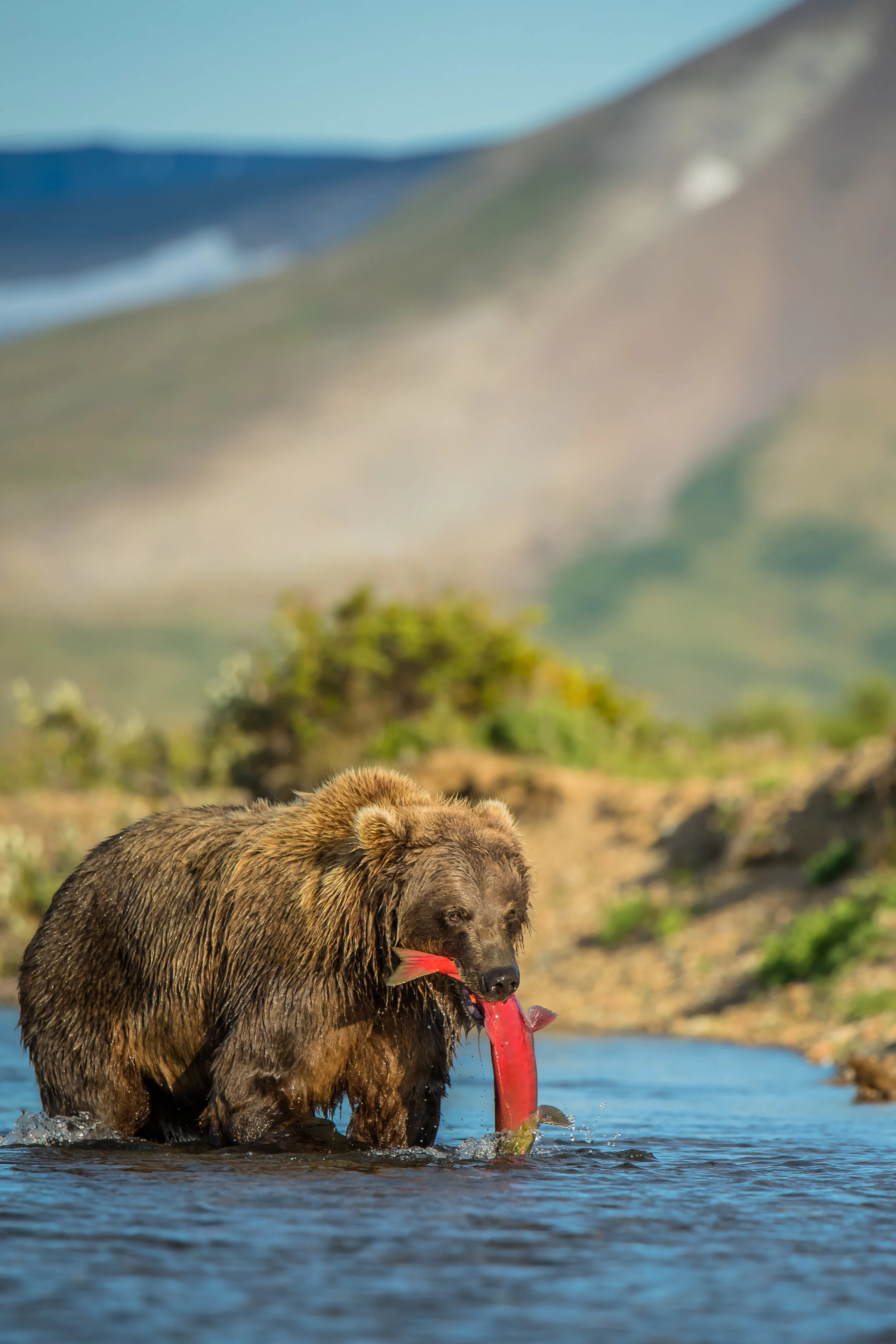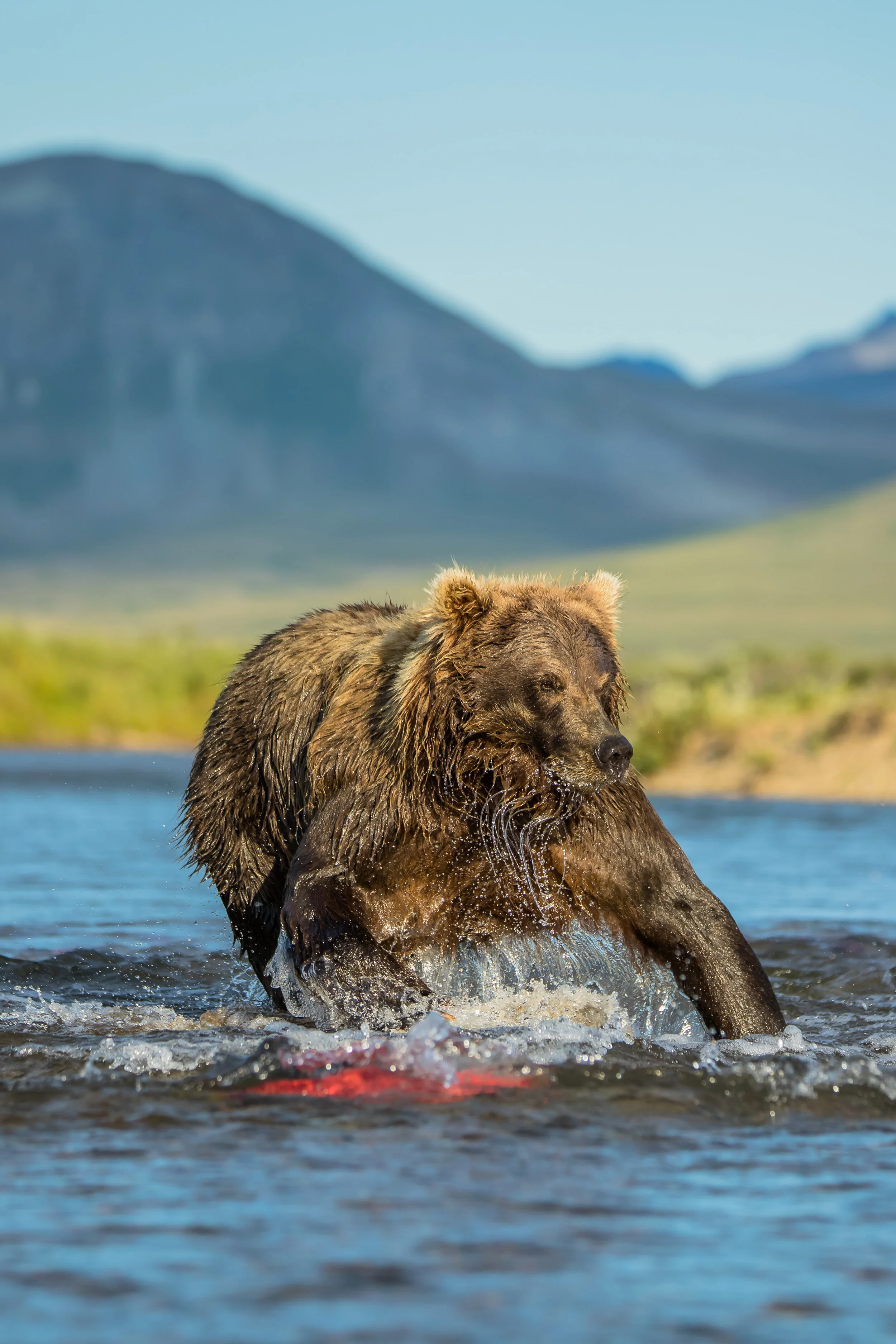 “The large male Brown Bear charged, seemingly coming right at me. I’d have been nervous if I didn’t know what he was really after. Rushing into the river he dove in. The splash was so big that I had to wipe water from my face on the opposite bank. Emerging from the frigid water with his prize, he shook, the large Salmon wriggling helplessly in his mouth.”