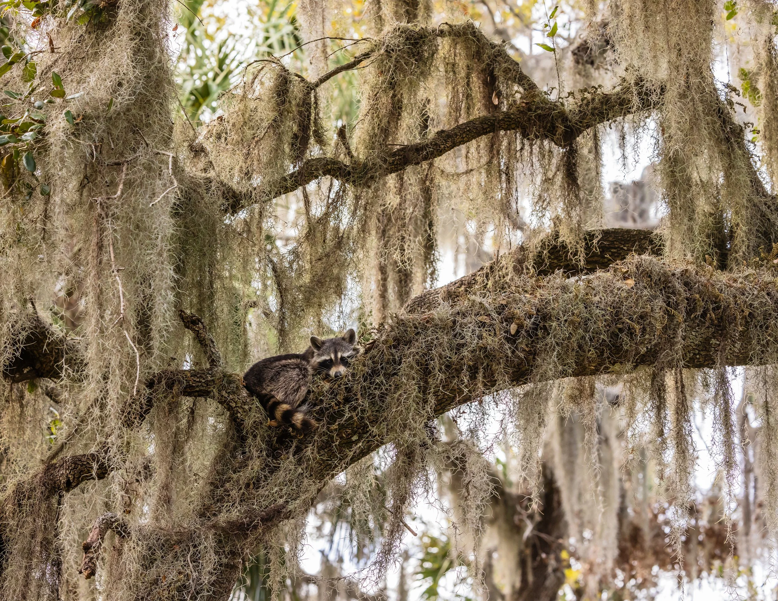 I walked along, taking in the beautiful scenery all around me. Moss and lichen blanketed the foliage and tree branches, the sun occasionally peeked through the ceiling of vegetation, and there, comfortably nestled in a cozy nook between some branches was a sleepy Raccoon! This was not some rabid pest raiding the local city dumpster, or the nuisance vermin robbing the dog’s food bowl on the back porch. But rather, this was a wild animal in a pristine, natural landscape. I watched and photographed this beautiful creature for the remainder of the day, thrilled to have had such a special encounter!